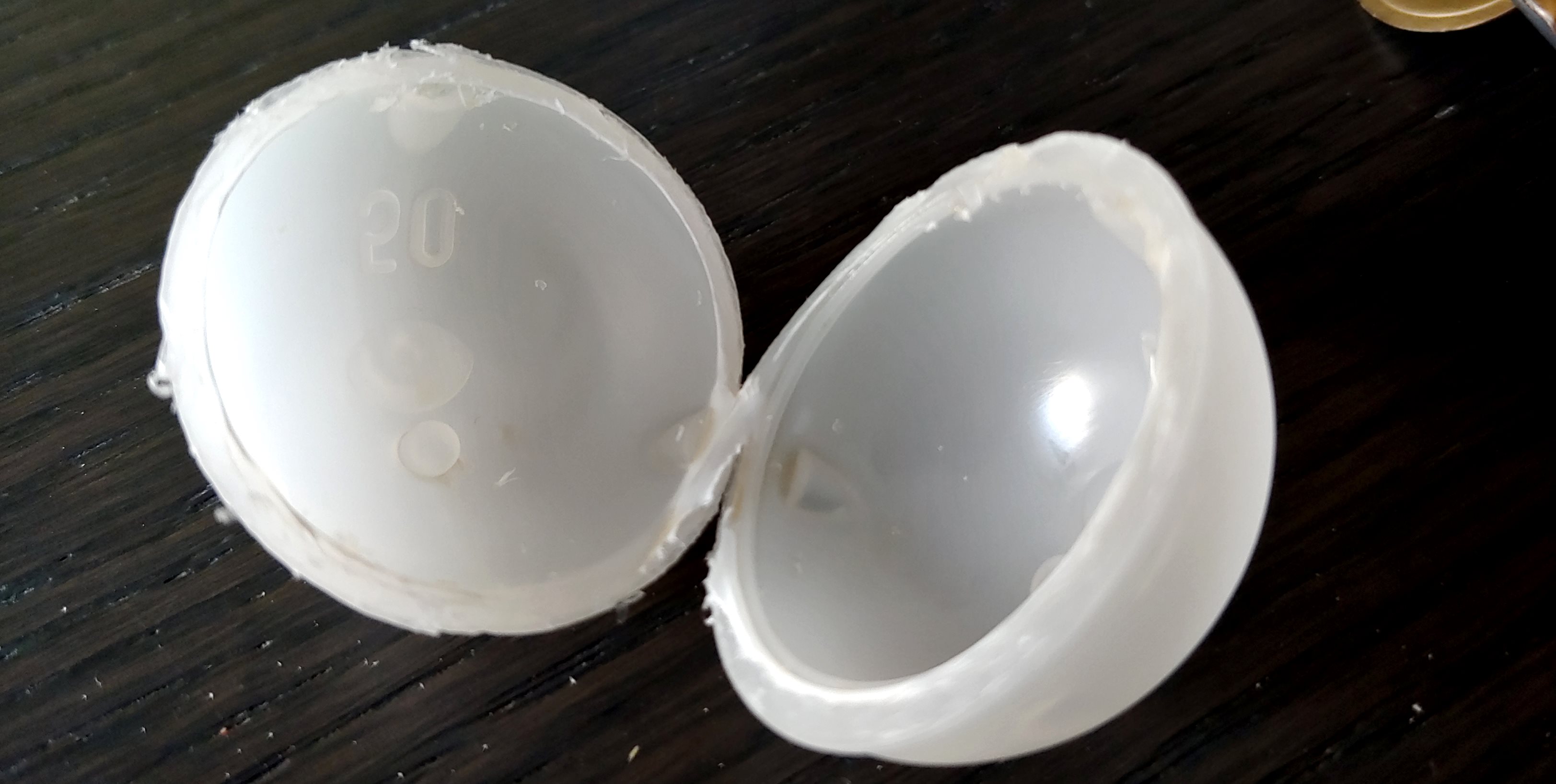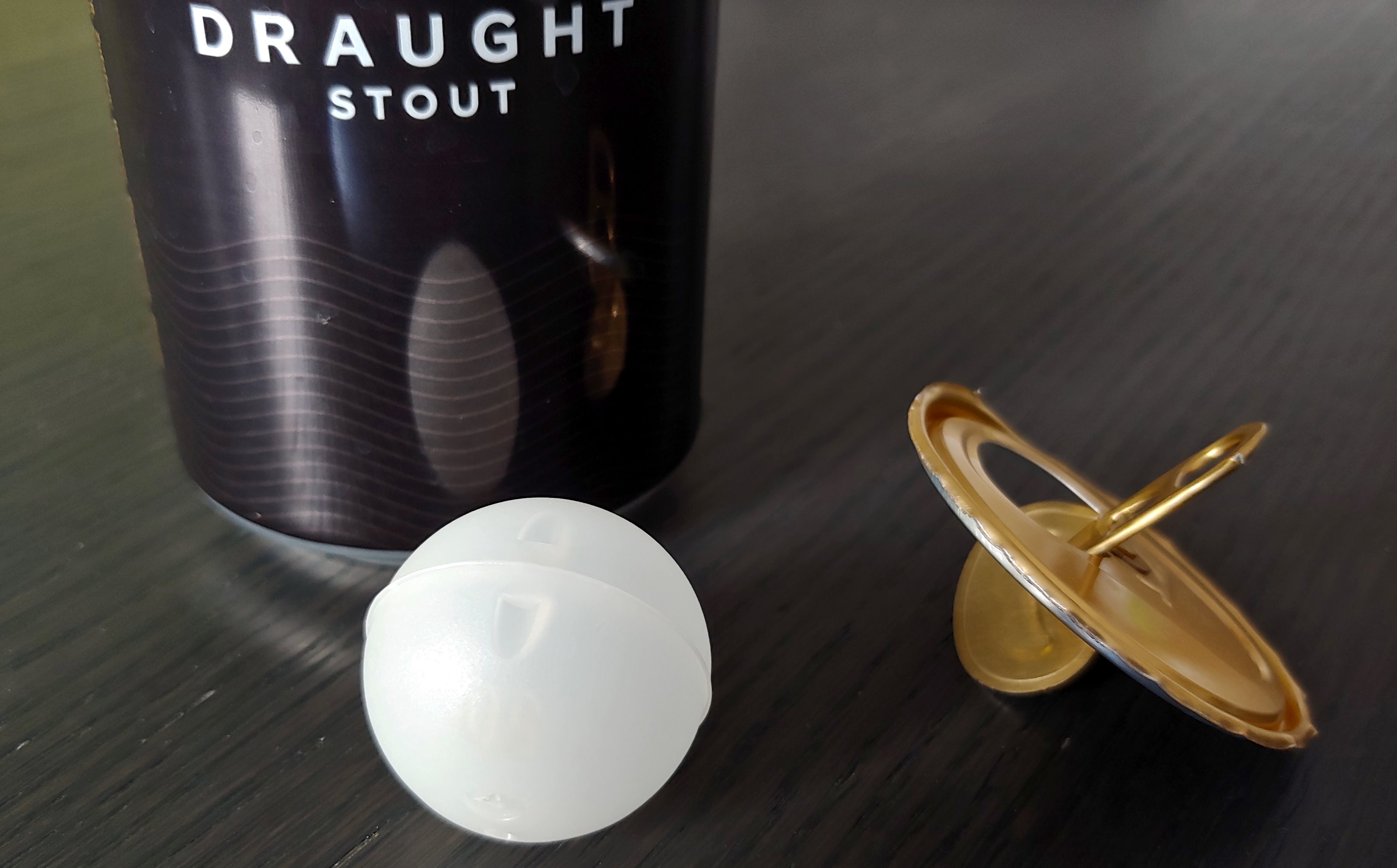 Auf dieses Kugelsystem hält Guinness, bzw. die Mutterfirma Diageo, das Patent. Wenn man das Kugel-Widget aufschneidet sieht man sofort, dass es sehr simpel aufgebaut ist. Es besteht aus ziemlich dickem Kunststoff und es enthält nur eine Kammer. Die einzige Öffnung ist ein winziges Loch, kleiner als 1 mm, durch das die Kugel gefüllt und entleert wird (sieht man auf meinem Foto nicht). Ein paar weitere Details zum Patent und dem Herstellprozess der Kugel findet man hier, wobei ich meine Hand für die Richtigkeit der Quelle nicht ins Feuer legen würde.