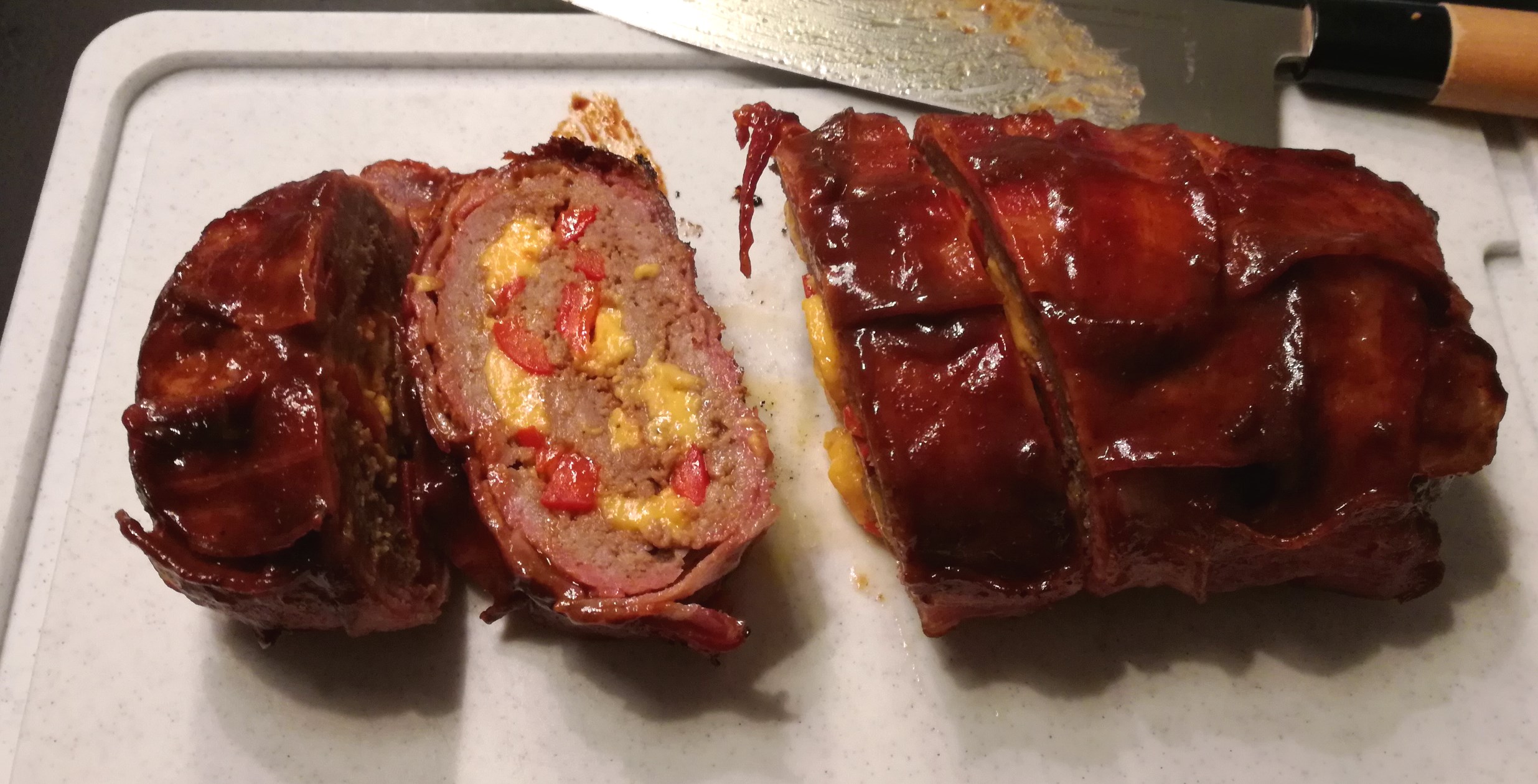 Theoretisch enthält die Käsefüllung auch die erwähnten „feinen Jalapenos“. Bei genauerer Betrachtung liegt deren Menge jedoch nur bei 0,4% des Anteils der Füllung. Diese hat wiederum 8% Anteil am Gesamtgewicht von 450 Gramm der Bacon Bomb. Falls mich die Prozentrechnung jetzt nicht im Stich gelassen hat, sind das also absolut gesehen 0,144 Gramm an feinen Jalapenos. Wenn man bedenkt, dass eine einzelne Schote etwa 10 Gramm wiegt, dann enthält die gesamte Bomb weniger als ein hauchdünnes Scheibchen einer Jalapenoschote.