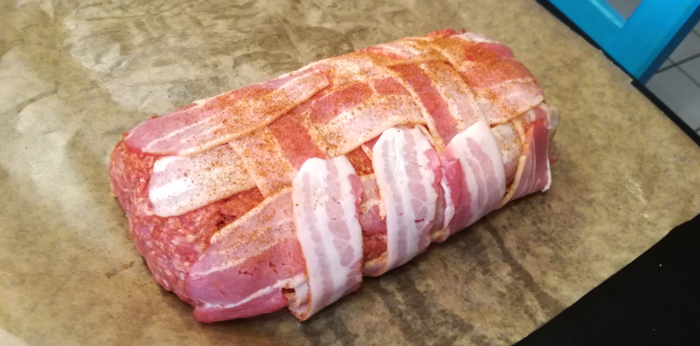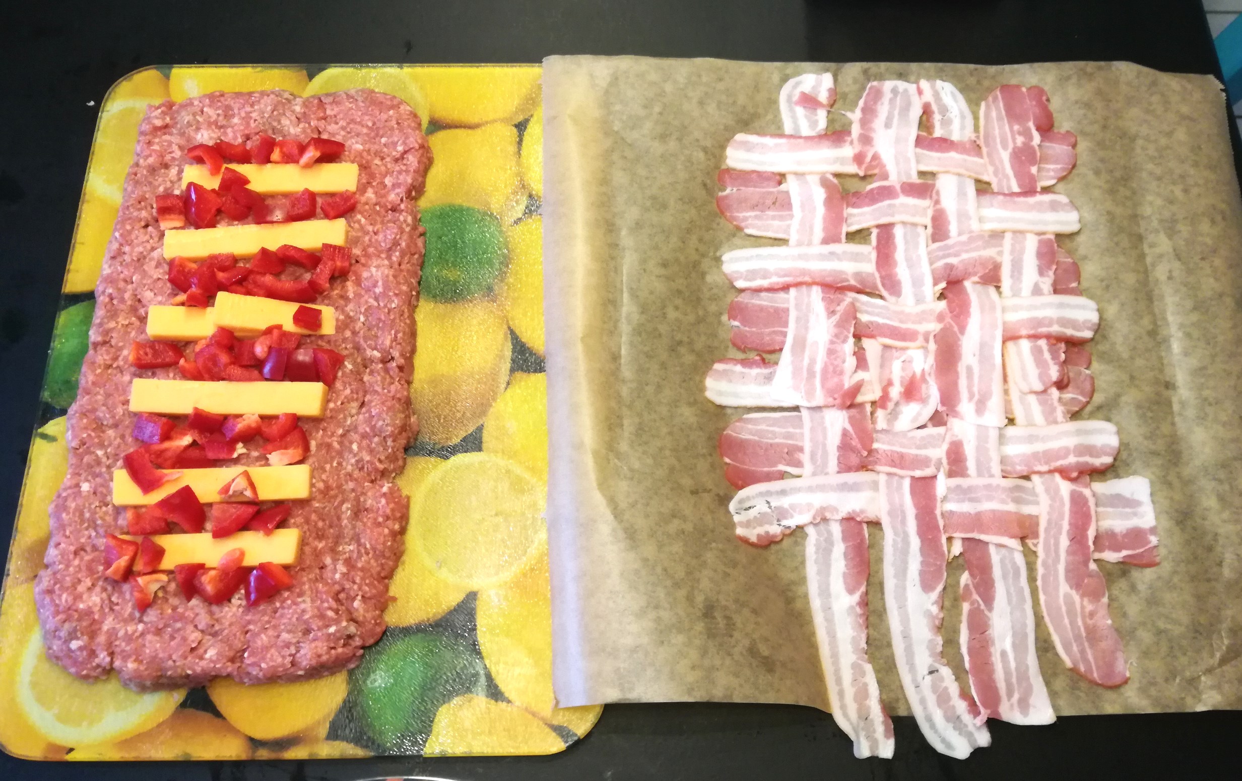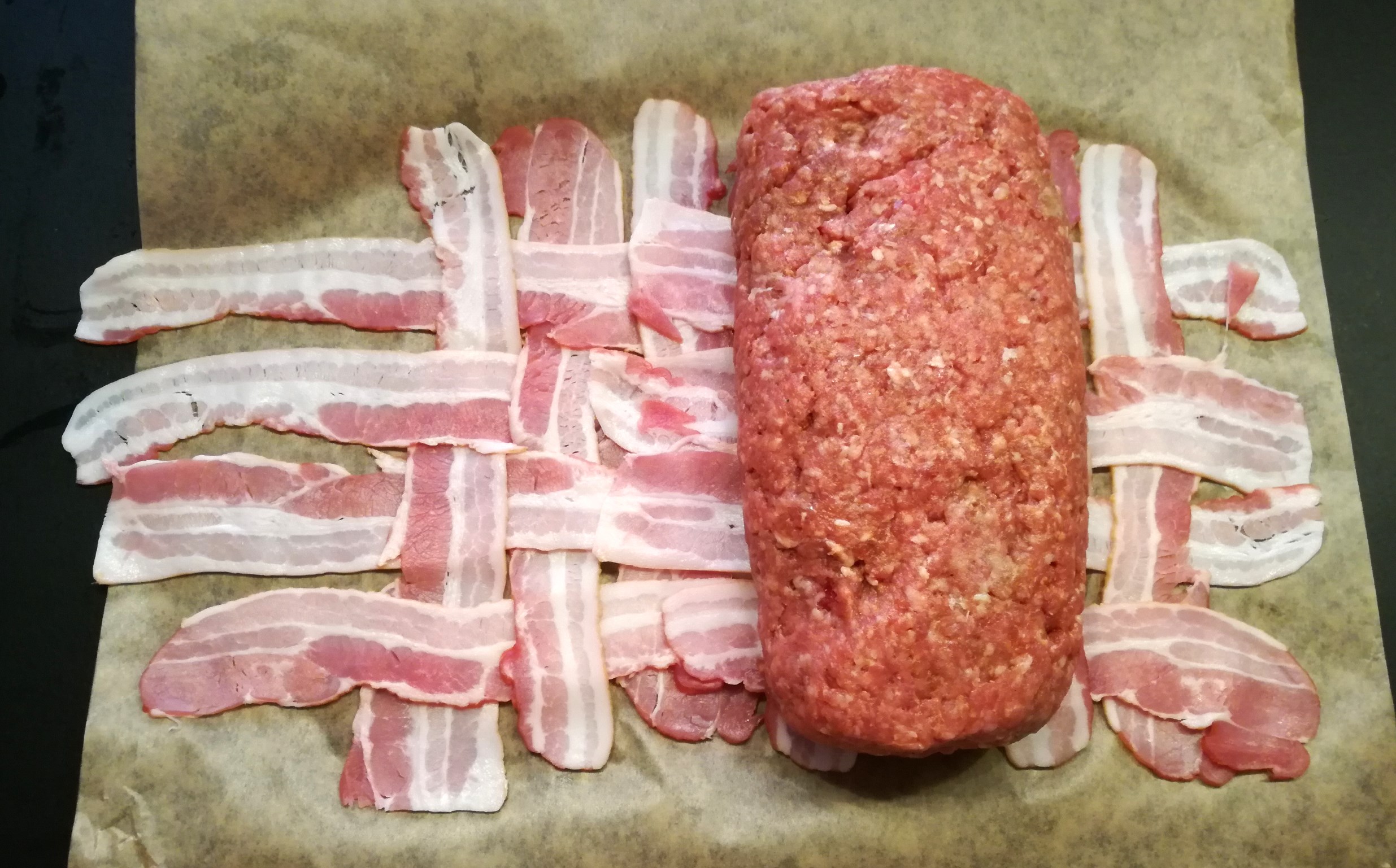 3. Ebenso kaufe man einige Päckchen Frühstücksspeck („Bacon“, von Lidl oder von woanders) und flechte aus den Scheiben ein Netz. Als Unterlage dient wieder ein Backpapier, das uns später wieder beim Einrollen gute Dienste leisten wird. Sehr zu empfehlen ist übrigens der etwas hochwertigere Bio-Bacon von Alnatura, der ein herrliches Raucharoma hat.