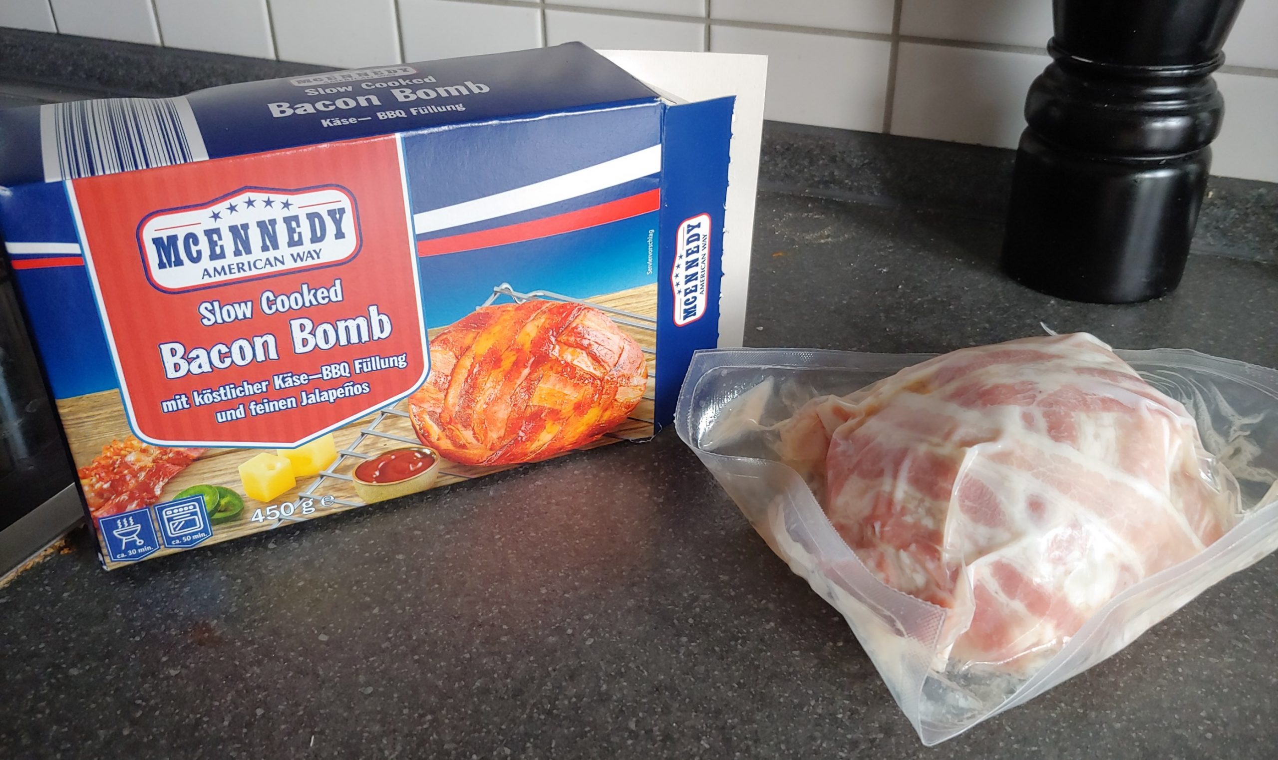 Doch nun zu dem, was uns Lidl (bzw. Gustoland, wie auch das Pseudo-Brisket aus meinem letzten Test) als fertig zu kaufende Bacon Bomb schmackhaft machen will. Zunächst fallen die immer wieder lustig klingenden phantastischen Markennamen auf, diesmal „MCENNEDY“ mit dem Untertitel „Slow Cooked“. Was bei einer Bacon Bomb zwar keine Rolle spielt, aber gut in den Hype rund um die „low and slow“ Thematik passt. Nach dem Auspacken liegt die Bombe gut in der Hand und würde sich prima als Wurfgeschoss eignen.