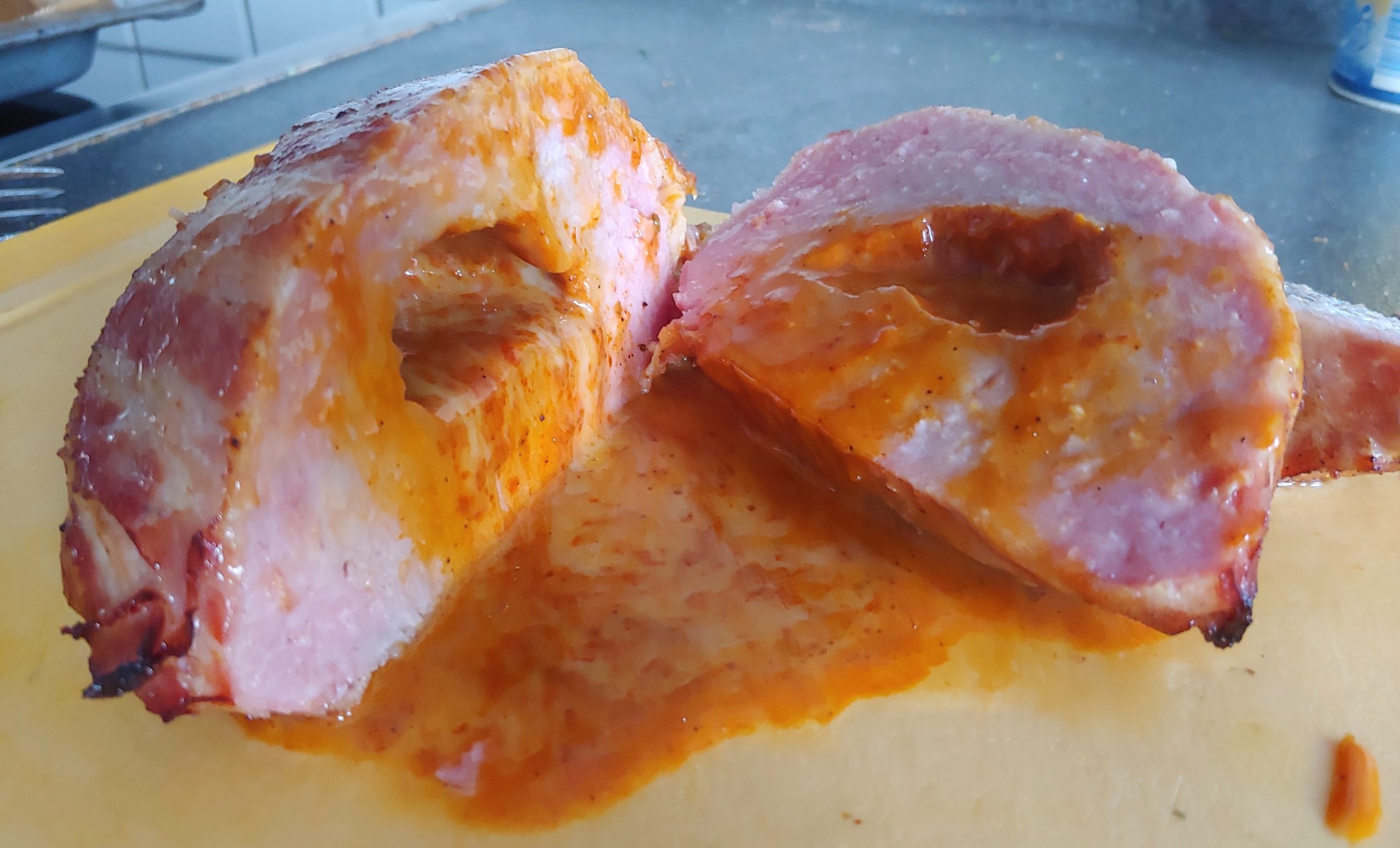 Da man auf ein Rub verzichtet hat, kommt wieder meine Eigenkreation zum Einsatz, eine Variante von „Magic Dust“ (nicht zu verwechseln mit „Angel Dust„). Eine Mischung, die sich auf Ribs, Pulled Pork und natürlich auch auf einer Bacon Bomb hervorragend macht. Dann ab damit in den Backofen bei 180 Grad Umluft und kucken, was passiert.Oben sieht man das Ergebnis: das harte gekochte Hackfleisch ist nach dem Backen noch härter geworden und die flüssige Füllung aus Käse mit BBQ-Sauce verteilt sich nach dem Anschneiden direkt ins Nirvana! Da hätten sich die Food-Ingenieure bei Gastroland mal ein bißchen mehr Mühe geben dürfen. Ganz schlecht schmeckt es nicht, das muss man dem Teil lassen. Die Geschmacksnerven werden mit einer Menge an Additiven überschüttet, ähnlich wie wenn man eine Tüte Chips auf ex leert.