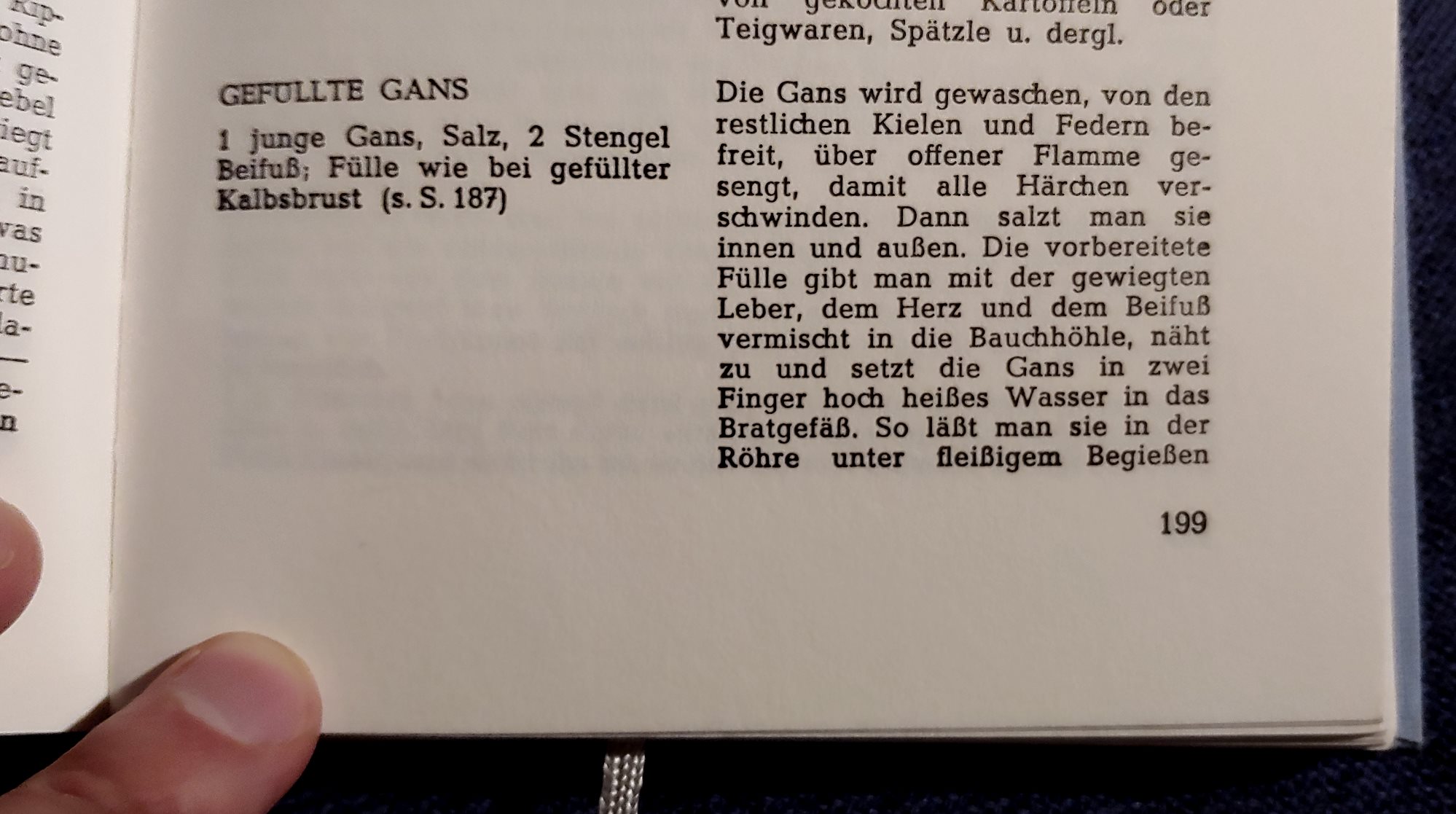 - Gans vorbereiten: überstehende Kiele entfernen, Fett überall wo man drankommt abziehen oder schneiden.