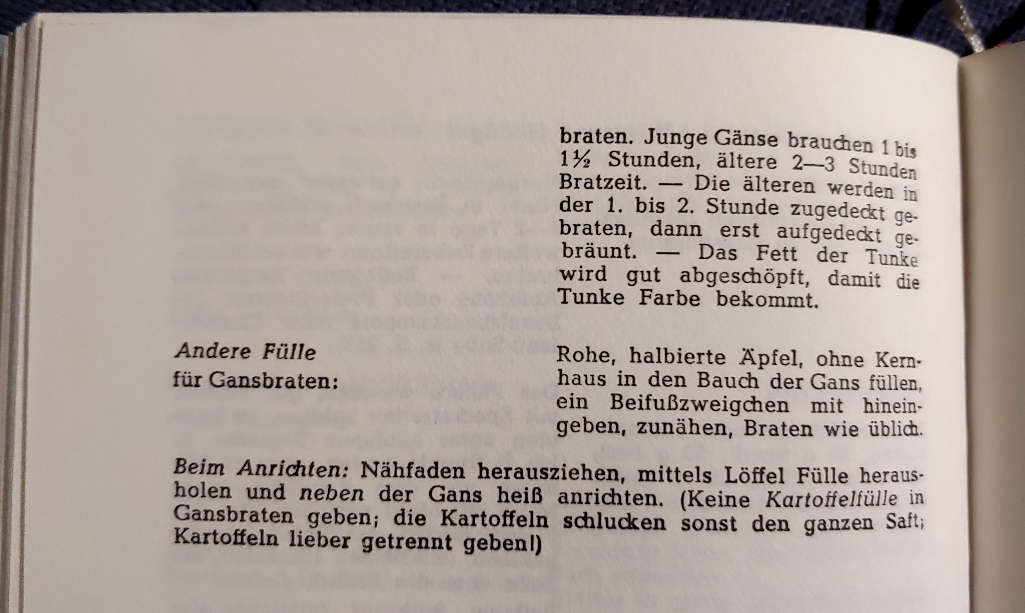 Am Ende nochmal das vollständige Rezept für einen Gänsebraten von 4,5 Kg Gewicht, der mit einer Mischung aus Niedrigtemperatur und Umluftbetrieb zubereitet wurde mitsamt den Garzeiten im jeweiligen Temperaturbereich: