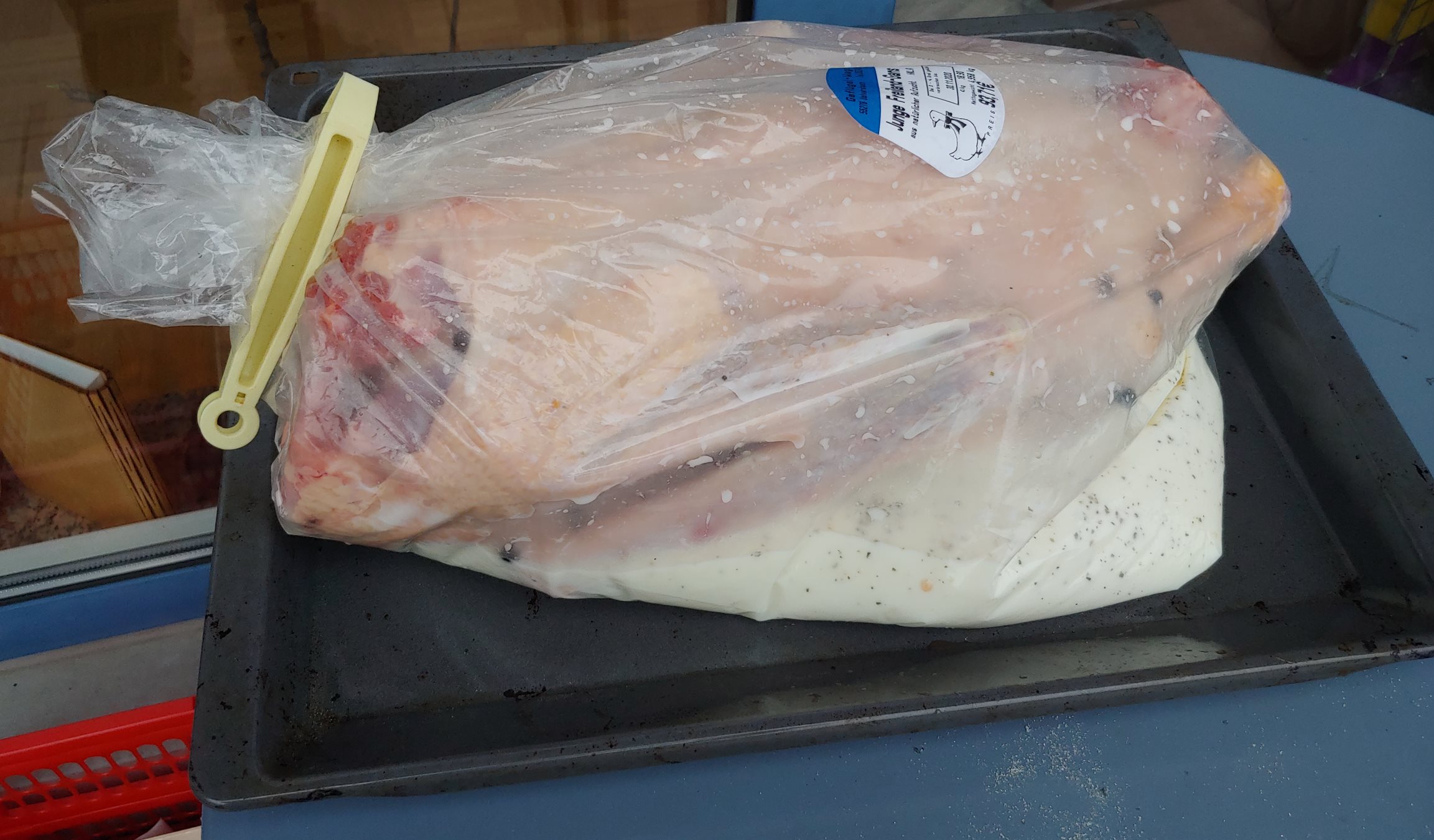 Um eine ganze Gans einzulegen braucht man locker 3 Liter Flüssigkeit, wenn die Gans im Beutel liegt (im Eimer eher 6 Liter) und dementsprechend 90 Gramm (180 Gramm für den Eimer) Salz. Das wirkt zunächst mal sehr viel. Aber es zieht ja auch nicht alles Salz in die Gans sondern es findet ein langsamer Ausgleich der Salzkonzentration zwischen Fleisch und Lake statt. Je länger man das Fleisch in der Lake lässt, desto vollständiger der Ausgleich. Die Einlegezeit ist auch der Grund für die oft unterschiedlich angegebene Stärke der Salzkonzentration. Hier ist also Vorsicht angebracht. Hat man keinen Beutel, kann auch ein Eimer verwendet werden, nur wird hierbei mehr Lake benötigt. Gänsezeit ist zum Glück im Winter und so kann der Eimer so lange wie es nötig ist draußen stehen bleiben.