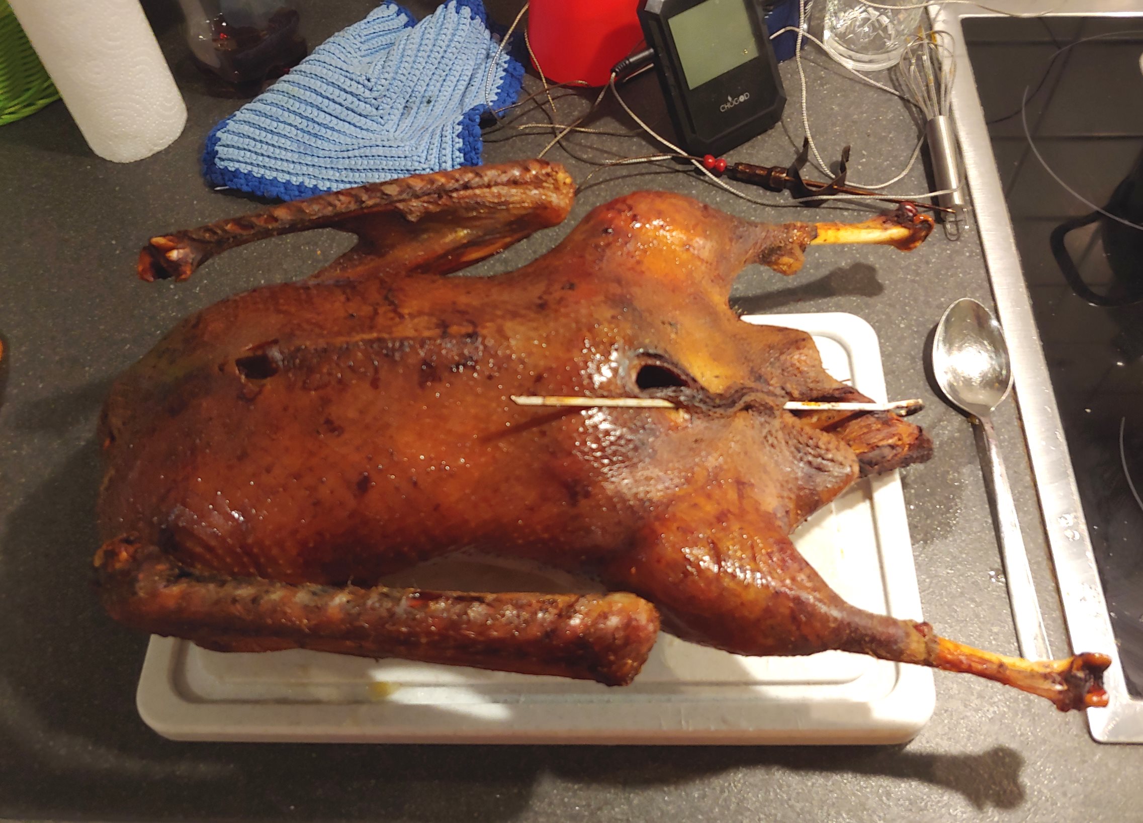 Hier muss ich einen kurzen Ausflug zu den Kerntemperaturen bei verschiedenen Fleischarten machen. Rindfleisch und durchzogenes Schwein vertragen eine höhere Kerntemperatur als Geflügel. Bei Rinderbrust sind 90 Grad Kerntemperatur wünschenswert. Bei durchzogenem Schweinenacken etwa 80 Grad und bei Schweinefilet 70 Grad. Man kann sich ungefähr folgende Regel merken: je durchwachsener, fettiger und größer ein Tier ist, desto mehr Temperatur und längere Garzeit verträgt es. Bei Geflügel wie Truthahn, Pute oder eben einer Gans stellt man 85 Grad Zieltemperatur ein. Da wir eine vollständige Gans zubereiten wollen, können wir schlecht das Bruststück bei 75 Grad Kerntemperatur herauslösen und den Rest weiter garen. Obwohl es so ideal wäre und irgendwann teste ich das auch mal. Also müssen wir mit dem Kompromiss leben, dass die Ofentemperatur von 85 Grad über einen sehr langen Zeitraum eingehalten werden muss, bis alle Teile der Gans ordentlich durch sind. Für die Brust ist das eher zu viel, aber für den Rest etwas zu wenig. So zumindest das Feedback meines geschätzten Bruders, der die Gänseschenkel nachher doch für etwas zu saftig hielt.